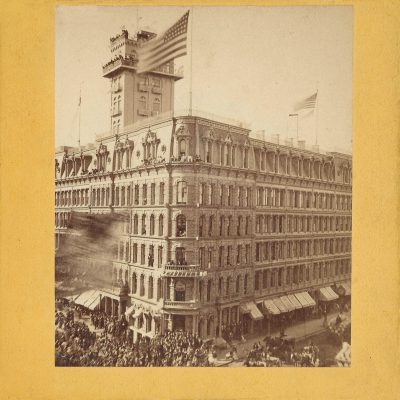 All three of the stereoviews that I scanned have the Powers Building in them. The one above looks like it was when there was a celebration going on. There are people hanging out of windows and on all the balconies including the balconies on the tower. The distortion on the left was probably from a flag flying. You can see a bigger version on this web page.