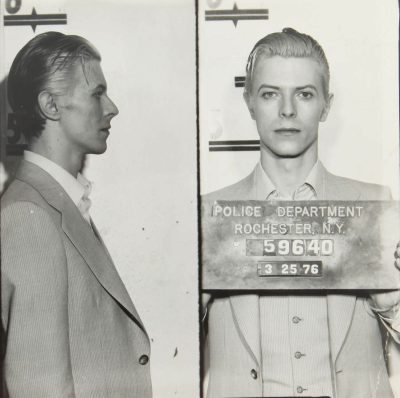 That photo of David is from 1976 when he and Iggy Pop were arrested in Rochester at their hotel after a concert. A jury refused to press the charge of Felony possession of marijuana. David never did appear in Rochester again. For years people wanted copies of the mugshot but couldn’t find it because they were looking for it under the name of “David Bowie.” Eventually someone realized the mug shot was filed under his real name “David Jones.” Now you can find the mugshot on stickers, mugs, and t-shirts.