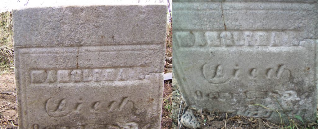 Jane Rall’s tombstone had one part still in the ground without any writing on it. Then there was another piece that sat an an angle in the ground and only had about 3 inches showing. We had to do a lot of digging to get that out. You can see the dirt line where it was buried. It only says “Jane, wife of Mangal (note spelling) Rall, died.” Somewhere there is another piece that we didn’t find with her death date and maybe an age.
