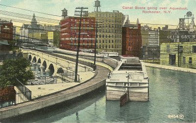 This postcard on the right shows boats going over the aqueduct that crosses the Genesee River. That aqueduct is still there as the base of the Broad Street bridge when the road was built over the top. That was because they re-route the canal in the early 1900s to south of Rochester.
