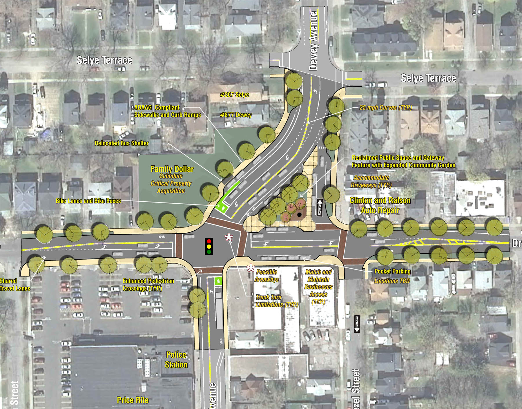 Finally after all this time the City of Rochester is making the jog into a curved section so that there is only one traffic light at the corner of Dewey and Driving Park (see the construction map). The first part of the project was for the City to acquire the former Family Dollar store that was on the northwest corner. It was knocked down as part of the new road alignment goes through that store’s old parking lot. The project is almost done. The roads are in the new alignment and only some landscaping needs to be completed.